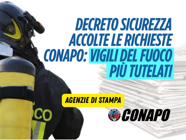 Decreto sicurezza, accolte le richieste Conapo: vigili del fuoco più tutelati (agenzie di stampa). da Redazione_Conapo 5 Giugno 2025 5 Giugno 2025 7,K DL SICUREZZA: ACCOLTE RICHIESTE CONAPO “PIÙ TUTELE PER VIGILI DEL FUOCO” Leggi la nota Scarica il PDF Stampa Condividi 0 FacebookTwitterPinterestWhatsappTelegramEmail Potrebbe piacerti anche Consiglio dei Ministri n. 151 – 11 Dicembre 2025 – Proroga termini – Disposizioni... 12 Dicembre 2025 Specialisti di aeromobile – Decreto di inquadramento ed assegnazione sede. 10 Dicembre 2025 Incontro governo-sindacati sulla legge di Bilancio, l’intervento del Segretario Generale Marco Piergallini. 9 Dicembre 2025 Procedura di assunzione di n. 97 unità nella qualifica di operatore nel ruolo degli... 9 Dicembre 2025 Nomina in ruolo dei Vigili del Fuoco appartenenti al 100° corso di formazione teorico-pratico... 9 Dicembre 2025 Concorso pubblico a 52 posti per l’accesso alla qualifica di Ispettore logistico gestionale del... 9 Dicembre 2025 post precedente Concorso pubblico, per esami, a 23 posti di vice direttore informatico nel C.N.VV.F. Avviso differimento prova scritta. prossimo post Assegnazione temporanea, ai sensi dell’art. 42 del DPR n. 64/2012, di personale appartenente alla specialità dei Sommozzatori nelle qualifiche dei Vigili del Fuoco, dei Capi Squadra e dei Capi Reparto presso il NSSA di Roma. Avvio interpello.