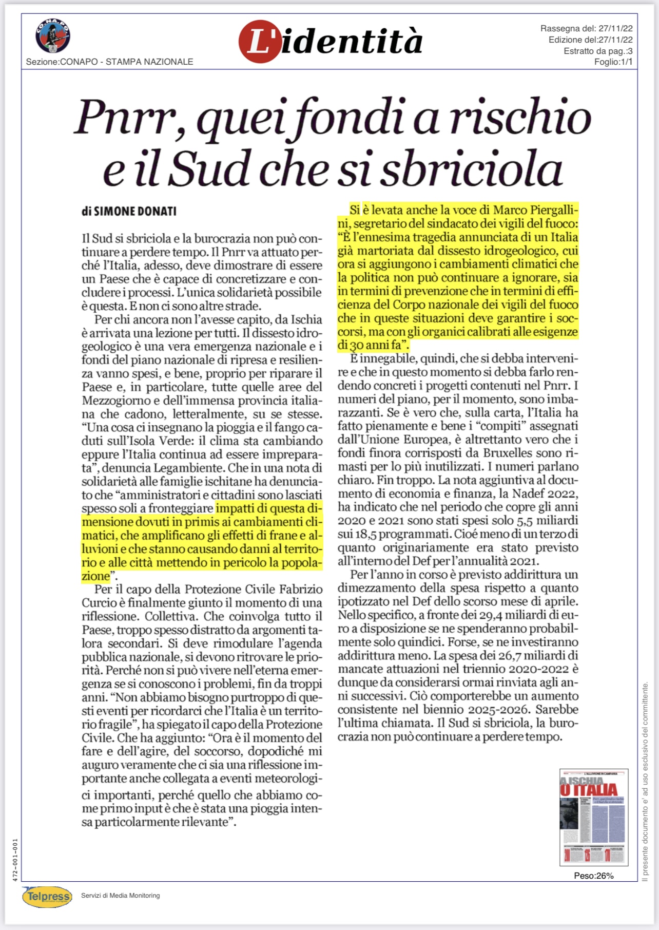 Dissesto idrogeologico e cambiamenti climatici. Il Conapo, maggiori assunzioni di vigili del fuoco (Quotidiano L’Identità). da Redazione_Conapo 27 Novembre 2022 27 Novembre 2022 893 Leggi la nota Scarica il PDF Stampa Condividi 0 FacebookTwitterPinterestWhatsappTelegramEmail Potrebbe piacerti anche Consiglio dei Ministri n. 151 – 11 Dicembre 2025 – Proroga termini – Disposizioni... 12 Dicembre 2025 Specialisti di aeromobile – Decreto di inquadramento ed assegnazione sede. 10 Dicembre 2025 Incontro governo-sindacati sulla legge di Bilancio, l’intervento del Segretario Generale Marco Piergallini. 9 Dicembre 2025 Procedura di assunzione di n. 97 unità nella qualifica di operatore nel ruolo degli... 9 Dicembre 2025 Nomina in ruolo dei Vigili del Fuoco appartenenti al 100° corso di formazione teorico-pratico... 9 Dicembre 2025 Concorso pubblico a 52 posti per l’accesso alla qualifica di Ispettore logistico gestionale del... 9 Dicembre 2025 post precedente 21 anni fa l’esplosione di Via Ventotene a Roma – il Conapo ricorda le vittime di quella immane tragedia. prossimo post Banca ore e rischio della prescrizione. Ulteriori indicazioni CONAPO a seguito dell’ultimo aggiornamento SIPEC.
