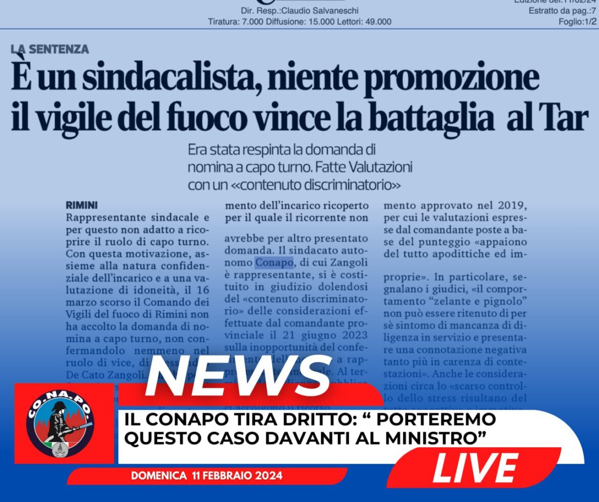 Per queste motivazioni come CONAPO siamo intervenuti in giudizio, limitatamente alla difesa delle attività sindacali. Il non affidare un incarico di capo turno inserendo tra le motivazioni l’essere sindacalista è un pericoloso precedente che, se non contrastato, rischia di estendersi anche nelle altre province e che non si deve più ripetere tra i comandanti dei vigili del fuoco altrimenti alzeremo ancora il tiro”.