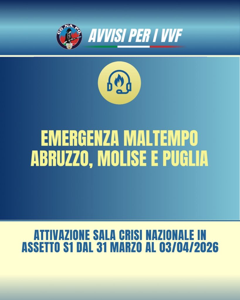 Emergenza maltempo Abruzzo, Molise e Puglia. Attivazione Sala Crisi nazionale in assetto S1 dal 31 marzo al 3 aprile 2026. da Redazione_Conapo 3 Aprile 2026 3 Aprile 2026 75 Leggi la nota Scarica il PDF Stampa Condividi 0 FacebookTwitterPinterestWhatsappTelegramEmail Potrebbe piacerti anche Concorso a capo squadra nautico, nautico di coperta capo e sommozzatore, decorrenze dal 2021... 3 Aprile 2026 Corsi Allievi vigili permanenti anno 2026. 3 Aprile 2026 Avviso concernente gli esiti della valutazione dei titoli della selezione interna, per la copertura... 2 Aprile 2026 Attività di aggiornamento del Sistema di protocollo informatico Vigilia. 2 Aprile 2026 Concorso CS nautici e sommozzatori, Conapo contesta corso formazione di 3 mesi. 2 Aprile 2026 Concorso a capo squadra personale specialista nautico di macchina, nautico di coperta e sommozzatore,... 1 Aprile 2026 post precedente Corsi Allievi vigili permanenti anno 2026. prossimo post Concorso a capo squadra nautico, nautico di coperta capo e sommozzatore, decorrenze dal 2021 al 2025. Avvio corso di formazione professionale.