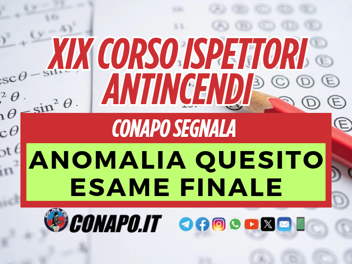 Esame finale XIX corso IA, Conapo chiede verifica urgente sul quesito n.1 da Redazione_Conapo 30 Agosto 2025 30 Agosto 2025 1,K Il Conapo segnala, a seguito dell’anomalia rappresentata dai partecipanti alla prova del 25 luglio scorso, una irregolarità sul quesito n.1. Leggi la nota per approfondire. Leggi la nota Scarica il PDF Stampa Condividi 0 FacebookTwitterPinterestWhatsappTelegramEmail Potrebbe piacerti anche Buona Santa Barbara. 4 Dicembre 2025 Riordino e modifiche al D.Lgs. 217/2005 – Osservazioni e richieste CONAPO per gli Aeronaviganti,... 1 Dicembre 2025 Prova orale selezioni per Ispettori piloti di aeromobile, Ispettori specialisti di aeromobile, Ispettori elisoccorritori.... 27 Novembre 2025 Riunione sul progetto di riforma ordinamentale del CNVVF – L’intervento del CONAPO. 26 Novembre 2025 Prova orale selezioni interne per 62 posti per Ispettori piloti di aeromobile; 62 posti... 21 Novembre 2025 Legge di bilancio, si va verso l’accoglimento delle richieste Conapo per i vigili del... 21 Novembre 2025 post precedente BENEVENTO – Richiesta visite mediche e accertamenti per il rischio di esposizione a fumi tossici. prossimo post La risposta alla nota del Conapo Veneto sulla grave carenza di organico.
