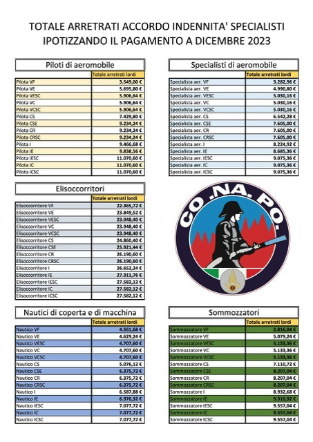 Tabella riepilogativa arretrati per il personale specialista del CNVVF derivanti dalla firma dell’accordo sindacale odierno.