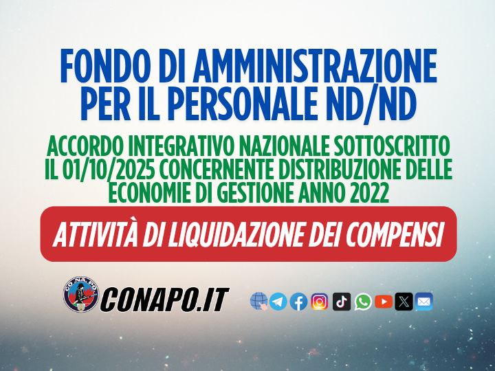 Fondo di amministrazione per il personale non direttivo/non dirigente, anno 2022 – Avvio attività di liquidazione dei compensi. da Redazione_Conapo 24 Ottobre 2025 24 Ottobre 2025 1,4K Fondo di amministrazione per il personale non direttivo/non dirigente – Accordo integrativo nazionale sottoscritto il 01/10/2025 concernente distribuzione delle economie di gestione anno 2022 – Avvio attività di liquidazione dei compensi. Leggi la nota Scarica il PDF Stampa Condividi 0 FacebookTwitterPinterestWhatsappTelegramEmail Potrebbe piacerti anche Screening oncologico e cardiovascolare per il personale in servizio e in quiescenza. 4 Dicembre 2025 Il Governo incontra Forze Armate, Comparto Sicurezza e Soccorso Pubblico. 4 Dicembre 2025 Buona Santa Barbara. 4 Dicembre 2025 Avvio 103° corso Allievi Vigili del Fuoco 3 Dicembre 2025 Procedura di selezione per 18 posti di specialista di aeromobile vigile del fuoco per... 3 Dicembre 2025 Avviso relativo alla “prova pratica tecnica” per l’accertamento dei requisiti attitudinali della selezione interna... 2 Dicembre 2025 post precedente Fondo di Produttività per il personale direttivo del CNVVF, anno 2022 – Avvio attività di liquidazione dei compensi. prossimo post Circolare n. 115316 del 06.06.2023 dell’Ispettorato Generale della Sanità Militare (IGESAN) in materia di istanze di riconoscimento della dipendenza da causa di servizio ed ascrivibilità tabellare ai fini della pensione privilegiata ordinaria