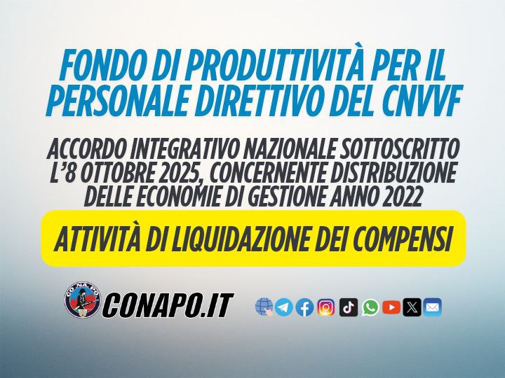 Fondo di Produttività per il personale direttivo del CNVVF, anno 2022 – Avvio attività di liquidazione dei compensi. da Redazione_Conapo 24 Ottobre 2025 24 Ottobre 2025 483 Fondo di Produttività per il personale direttivo del CNVVF – Accordo Integrativo Nazionale sottoscritto l’8 ottobre 2025, concernente distribuzione delle economie di gestione anno 2022 – Avvio attività di liquidazione dei compensi. Leggi la nota Scarica il PDF Stampa Condividi 0 FacebookTwitterPinterestWhatsappTelegramEmail Potrebbe piacerti anche Screening oncologico e cardiovascolare per il personale in servizio e in quiescenza. 4 Dicembre 2025 Il Governo incontra Forze Armate, Comparto Sicurezza e Soccorso Pubblico. 4 Dicembre 2025 Buona Santa Barbara. 4 Dicembre 2025 Avvio 103° corso Allievi Vigili del Fuoco 3 Dicembre 2025 Procedura di selezione per 18 posti di specialista di aeromobile vigile del fuoco per... 3 Dicembre 2025 Avviso relativo alla “prova pratica tecnica” per l’accertamento dei requisiti attitudinali della selezione interna... 2 Dicembre 2025 post precedente LOMBARDIA – Risposta a nota CONAPO su richiesta di intervento per la rimozione dei mezzi fuori uso presso le sedi di Dalmine e Bergamo. prossimo post Fondo di amministrazione per il personale non direttivo/non dirigente, anno 2022 – Avvio attività di liquidazione dei compensi.