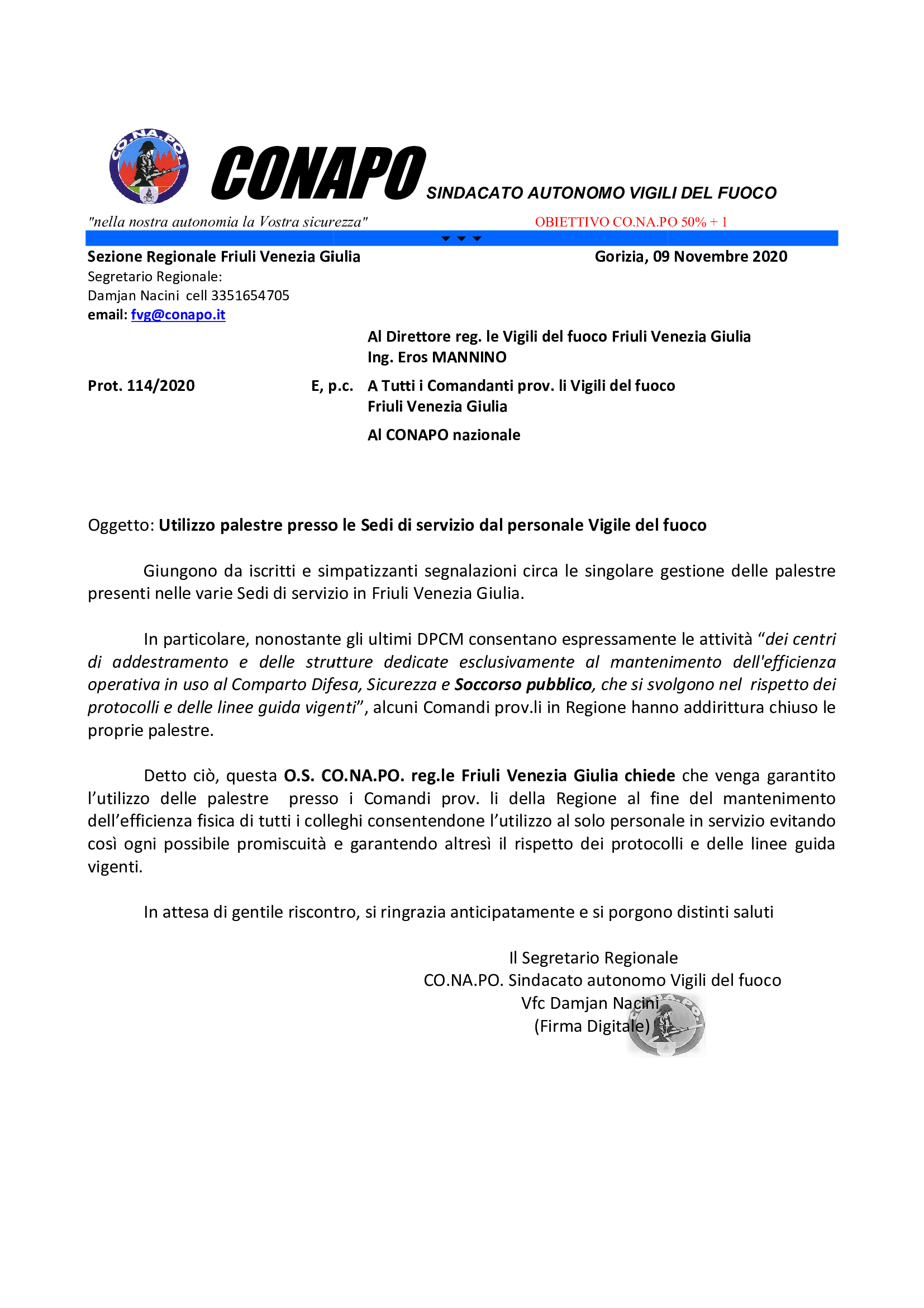 FRIULI VENEZIA GIULIA – Utilizzo palestre presso le Sedi di servizio dal personale Vigile del fuoco. da CONAPO 9 Novembre 2020 9 Novembre 2020 408 Condividi 0 FacebookTwitterPinterestWhatsappTelegramEmail Potrebbe piacerti anche PRATO – Escrementi di topi e uccelli nella mensa dei vigili del fuoco: proclamato... 2 Dicembre 2025 PERUGIA – Richiesta di intitolazione della sede VV.F. di Perugia alla memoria del Vigile... 28 Novembre 2025 BELLUNO – Il Prefetto accoglie la richiesta CONAPO dopo la segnalazione in merito alla... 24 Novembre 2025 RIMINI – Urgente ripristino impianto di climatizzazione presso distaccamento di Cattolica. 23 Novembre 2025 REGGIO EMILIA – Mozione ordinaria per il Consiglio comunale, carenza organico dei Vigili del... 21 Novembre 2025 REGGIO EMILIA – i motivi dello stato di agitazione CONAPO (video). 21 Novembre 2025 post precedente CAMPANIA – Campagna AIB 2021 – Convenzione tra Ente Parco Nazionale del Vesuvio – Terra dei Fuochi – in convenzione con la Regione Campania. prossimo post Ridislocazione sul territorio delle strutture per il controllo delle tute 1AET.