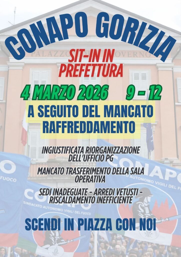 GORIZIA – Il Conapo si mobilità, indetto il sit-in per il 4 marzo 2026 davanti alla Prefettura di Gorizia. da Redazione_Conapo 28 Febbraio 2026 28 Febbraio 2026 73 Condividi 0 FacebookTwitterPinterestWhatsappTelegramEmail Potrebbe piacerti anche TERAMO – Inadeguatezza uniforme di servizio in contesti operativi caratterizzati da basse temperature e... 27 Febbraio 2026 GORIZIA – Vigili del fuoco di verso lo sciopero (rassegna stampa). 26 Febbraio 2026 GORIZIA – Vigili del fuoco verso lo sciopero. 25 Febbraio 2026 FRIULI VENEZIA GIULIA – Secondo sollecito del Conapo, richiesta urgente ripristino pavimentazione Sala Operativa Direzione... 25 Febbraio 2026 “Matera Capitale Mediterranea della Cultura e del Dialogo 2026”; sostegno alla richiesta di incremento... 25 Febbraio 2026 SASSARI – Segnalazione anomalia nominativi componenti commissioni d’esame D.lgs. 81/08. 24 Febbraio 2026 post precedente TERAMO – Inadeguatezza uniforme di servizio in contesti operativi caratterizzati da basse temperature e innevamento.
