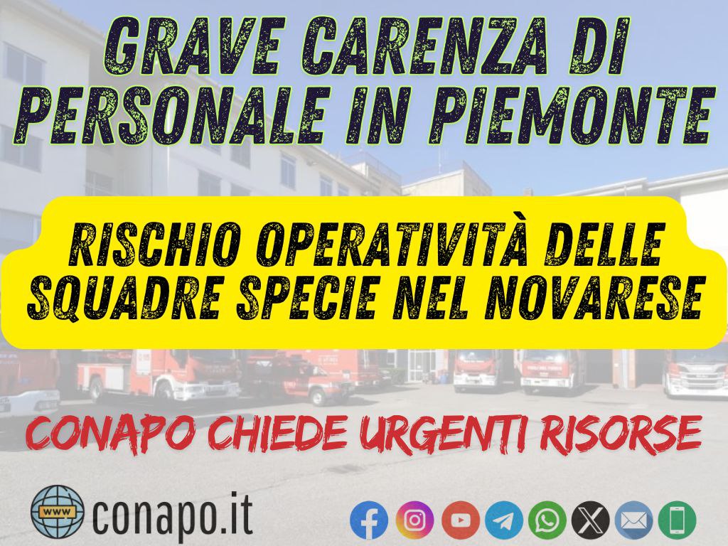Grave carenza di personale in Piemonte. Rischio operatività delle squadre specie nel novarese. Conapo chiede urgenti risorse. da Redazione_Conapo 19 Marzo 2025 19 Marzo 2025 4,2K Clicca qui e guarda il servizio Condividi 0 FacebookTwitterPinterestWhatsappTelegramEmail Potrebbe piacerti anche PRATO – Escrementi di topi e uccelli nella mensa dei vigili del fuoco: proclamato... 2 Dicembre 2025 PERUGIA – Richiesta di intitolazione della sede VV.F. di Perugia alla memoria del Vigile... 28 Novembre 2025 BELLUNO – Il Prefetto accoglie la richiesta CONAPO dopo la segnalazione in merito alla... 24 Novembre 2025 RIMINI – Urgente ripristino impianto di climatizzazione presso distaccamento di Cattolica. 23 Novembre 2025 REGGIO EMILIA – Mozione ordinaria per il Consiglio comunale, carenza organico dei Vigili del... 21 Novembre 2025 REGGIO EMILIA – i motivi dello stato di agitazione CONAPO (video). 21 Novembre 2025 post precedente Rischio PFAS e colleghi deceduti ad Arezzo – accolta la richiesta Conapo di analisi del sangue e studio epidemiologico nei vigili del fuoco, il nostro commento sul quotidiano La Nazione. prossimo post NAPOLI – Emergenza Campi Flegrei – Rassegna stampa.