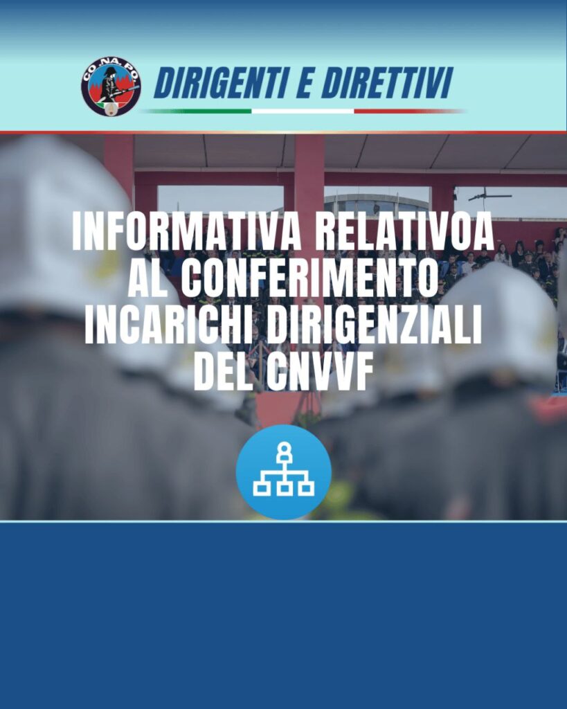 Informativa relativa al conferimento di incarichi dirigenziali. da Redazione_Conapo 27 Gennaio 2026 27 Gennaio 2026 220 Leggi la nota Scarica il PDF Stampa Condividi 0 FacebookTwitterPinterestWhatsappTelegramEmail Potrebbe piacerti anche Mobilità del personale appartenente al ruolo degli ispettori logistico gestionali del Corpo Nazionale dei... 27 Gennaio 2026 Concorso pubblico a 189 posti nella qualifica di Ispettore Logistico Gestionale – Circolare scelta... 27 Gennaio 2026 Carenza di personale del ruolo dei capi squadra e dei capi reparto – Attribuzione... 26 Gennaio 2026 Carenze a carico delle sedi di appartenenza del personale formatore professionale e di settore... 26 Gennaio 2026 Informativa per i Direttori Vicedirigenti e per i Direttori Logistico-Gestionali – Aggiornamento del fascicolo... 26 Gennaio 2026 Consultazioni elettorali e referendarie di domenica 22 e lunedì 23 marzo 2026. Referendum popolare... 26 Gennaio 2026 post precedente Mobilità del personale appartenente al ruolo degli ispettori logistico gestionali del Corpo Nazionale dei Vigili del Fuoco – Informativa elenco trasferendi.