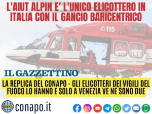 L’Aiut Alpin Dolomites è l’unico elicottero in Italia con il gancio baricentrico – la replica del CONAPO, gli elicotteri dei vigili del fuoco lo hanno e solo a Venezia ve ne sono due (Il Gazzettino).