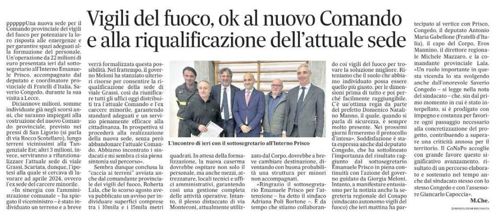 LECCE – Importante passo avanti per le strutture dei Vigili del Fuoco, definito l’accordo per la nuova sede centrale. da Redazione_Conapo 14 Novembre 2025 14 Novembre 2025 271 Leggi la nota Scarica il PDF Stampa Leggi la nota (2) Scarica il PDF (2) Stampa (2) Condividi 0 FacebookTwitterPinterestWhatsappTelegramEmail Potrebbe piacerti anche PRATO – Escrementi di topi e uccelli nella mensa dei vigili del fuoco: proclamato... 2 Dicembre 2025 PERUGIA – Richiesta di intitolazione della sede VV.F. di Perugia alla memoria del Vigile... 28 Novembre 2025 BELLUNO – Il Prefetto accoglie la richiesta CONAPO dopo la segnalazione in merito alla... 24 Novembre 2025 RIMINI – Urgente ripristino impianto di climatizzazione presso distaccamento di Cattolica. 23 Novembre 2025 REGGIO EMILIA – Mozione ordinaria per il Consiglio comunale, carenza organico dei Vigili del... 21 Novembre 2025 REGGIO EMILIA – i motivi dello stato di agitazione CONAPO (video). 21 Novembre 2025 post precedente Concorso pubblico a 38 posti per l’accesso alla qualifica di Vice Direttore del C.N.VV.F. – pubblicazione calendario prova orale. prossimo post Messaggio dell’On. Sottosegretario Emanuele Prisco in occasione della XlV ricorrenza della S. Croce e in ricordo di Antonio Brizzi.