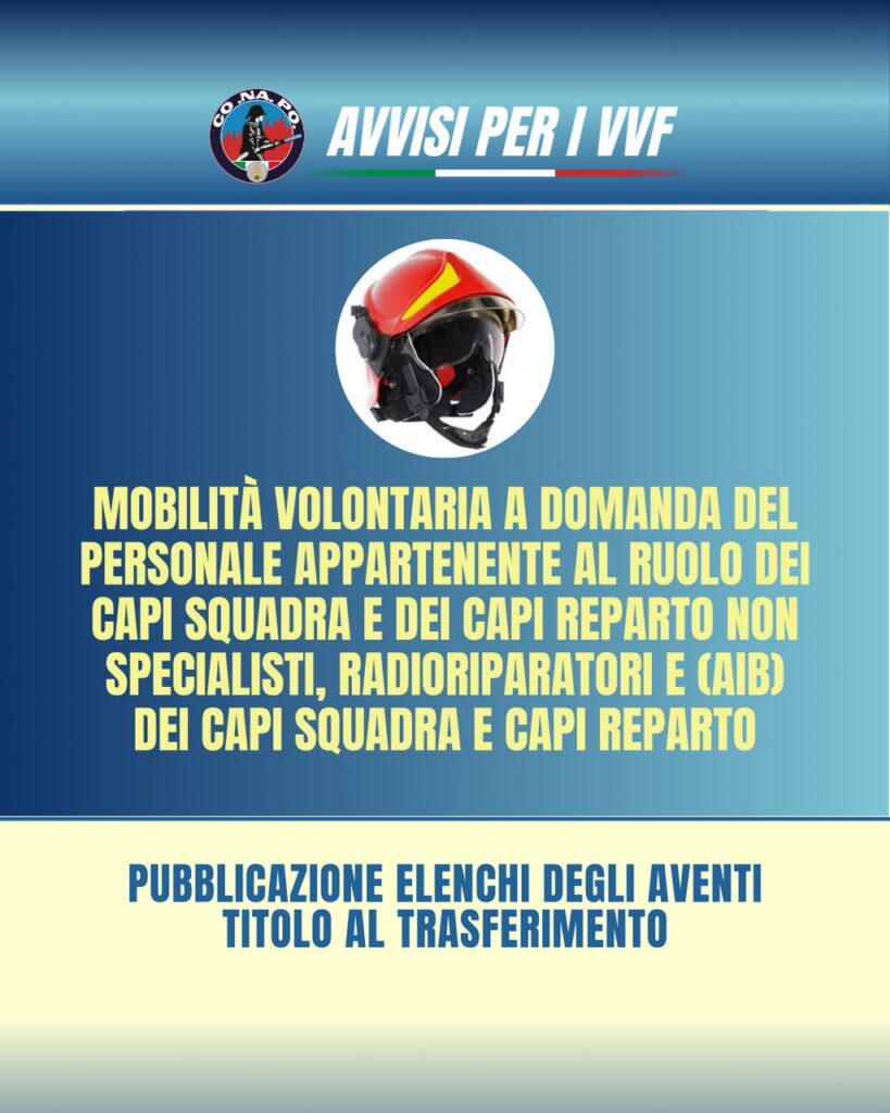 Mobilità volontaria a domanda del personale appartenente al ruolo dei Capi Squadra e dei Capi Reparto non specialisti, radioriparatori, e al ruolo speciale ad esaurimento Antincendio Boschivo (AIB) dei Capi Squadra e Capi Reparto. Pubblicazione elenchi degli aventi titolo al trasferimento.
