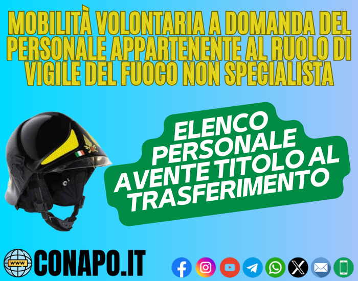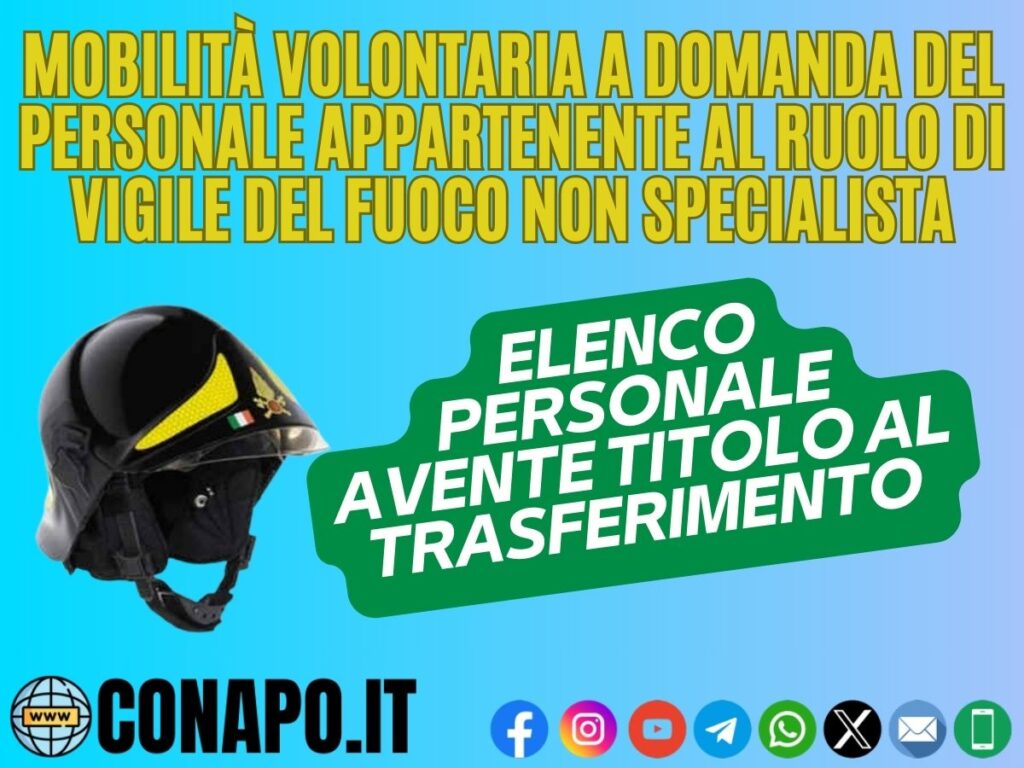 Mobilità volontaria a domanda del personale appartenente al ruolo di Vigile del Fuoco non specialista. Circolare prot. n. 44522 del 24/07/2023 – Elenco del personale avente titolo al trasferimento.