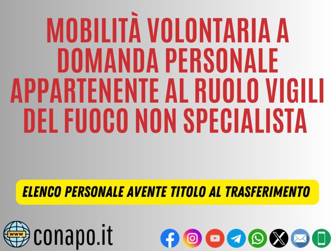 Mobilità volontaria a domanda del personale appartenente al ruolo dei Vigili del Fuoco non specialisti, radioriparatori, e al ruolo speciale ad esaurimento Antincendio Boschivo (AIB) dei Vigili del Fuoco. Comunicazione elenco aventi titolo al trasferimento.
