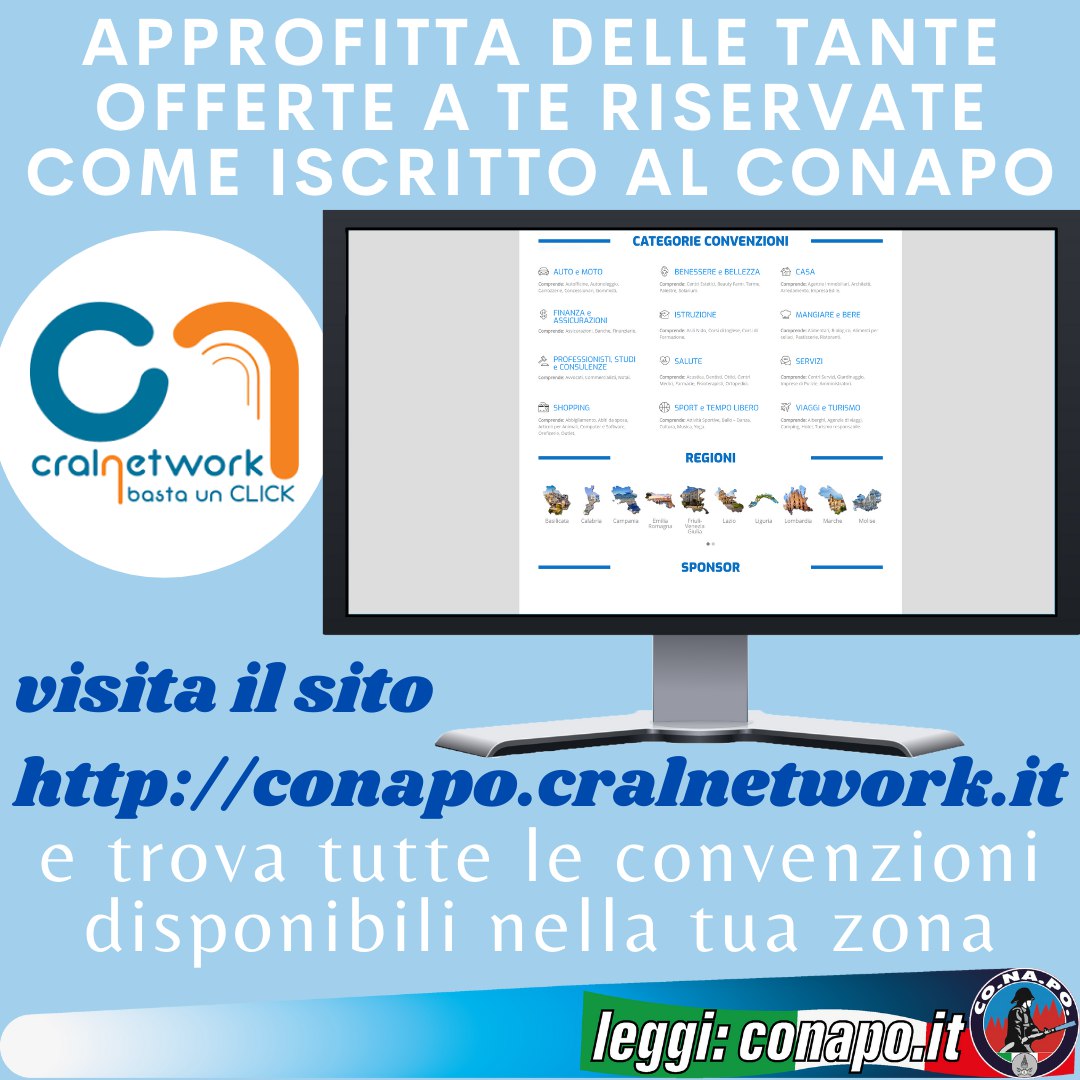 Offerte commerciali e sconti per iscritti al CONAPO (circuito Cralnetwork). da CONAPO 27 Luglio 2021 27 Luglio 2021 410 Vai su http://conapo.cralnetwork.it/ per le convenzioni nella tua zona Condividi 0 FacebookTwitterPinterestWhatsappTelegramEmail Potrebbe piacerti anche Incontro governo-sindacati sulla legge di Bilancio, l’intervento del Segretario Generale Marco Piergallini. 9 Dicembre 2025 Buona Santa Barbara. 4 Dicembre 2025 Riordino e modifiche al D.Lgs. 217/2005 – Osservazioni e richieste CONAPO per gli Aeronaviganti,... 1 Dicembre 2025 Prova orale selezioni per Ispettori piloti di aeromobile, Ispettori specialisti di aeromobile, Ispettori elisoccorritori.... 27 Novembre 2025 Riunione sul progetto di riforma ordinamentale del CNVVF – L’intervento del CONAPO. 26 Novembre 2025 Prova orale selezioni interne per 62 posti per Ispettori piloti di aeromobile; 62 posti... 21 Novembre 2025 post precedente Schema di regolamento di disciplina del personale del Corpo Nazionale dei Vigili del fuoco, ai sensi dell’art. 239 del decreto legislativo 13 ottobre 2005, n. 217 – Convocazione incontro 2 agosto 2021. prossimo post Decreto 8 luglio 2021 – Distintivi di qualifica del personale dei ruoli operativi del Corpo nazionale dei vigili del fuoco.