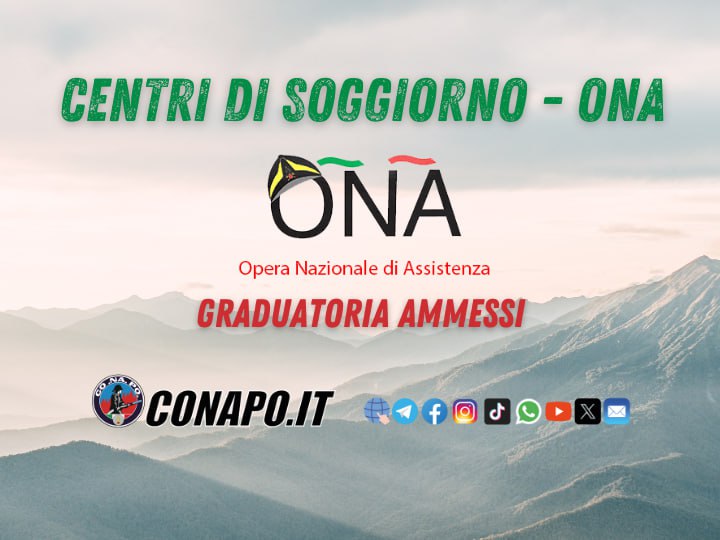 ONA – Graduatoria degli ammessi ai centri di soggiorno inverno 2025-2026. da Redazione_Conapo 2 Dicembre 2025 2 Dicembre 2025 2,5K Si comunica che in data 01/12/2025 il C.d.A dell’ONA ha deliberato l’apertura, per la stagione inverno 2025-2026, dei Centri di soggiorno di Cei, Merano e Montalcino, in allegato la graduatoria degli ammessi. Merano Montalcino Cei al Lago Condividi 0 FacebookTwitterPinterestWhatsappTelegramEmail Potrebbe piacerti anche Screening oncologico e cardiovascolare per il personale in servizio e in quiescenza. 4 Dicembre 2025 Il Governo incontra Forze Armate, Comparto Sicurezza e Soccorso Pubblico. 4 Dicembre 2025 Buona Santa Barbara. 4 Dicembre 2025 Avvio 103° corso Allievi Vigili del Fuoco 3 Dicembre 2025 Procedura di selezione per 18 posti di specialista di aeromobile vigile del fuoco per... 3 Dicembre 2025 Avviso relativo alla “prova pratica tecnica” per l’accertamento dei requisiti attitudinali della selezione interna... 2 Dicembre 2025 post precedente PRATO – Escrementi di topi e uccelli nella mensa dei vigili del fuoco: proclamato lo stato di agitazione e chiesto l’intervento del Governo. prossimo post Concorsi pubblici a 5 posti per l’accesso alla qualifica di ispettore sanitario e a 7 posti di per l’accesso al ruolo degli atleti del gruppo sportivo vigili del fuoco Fiamme Rosse. Pubblicazione graduatorie finali.