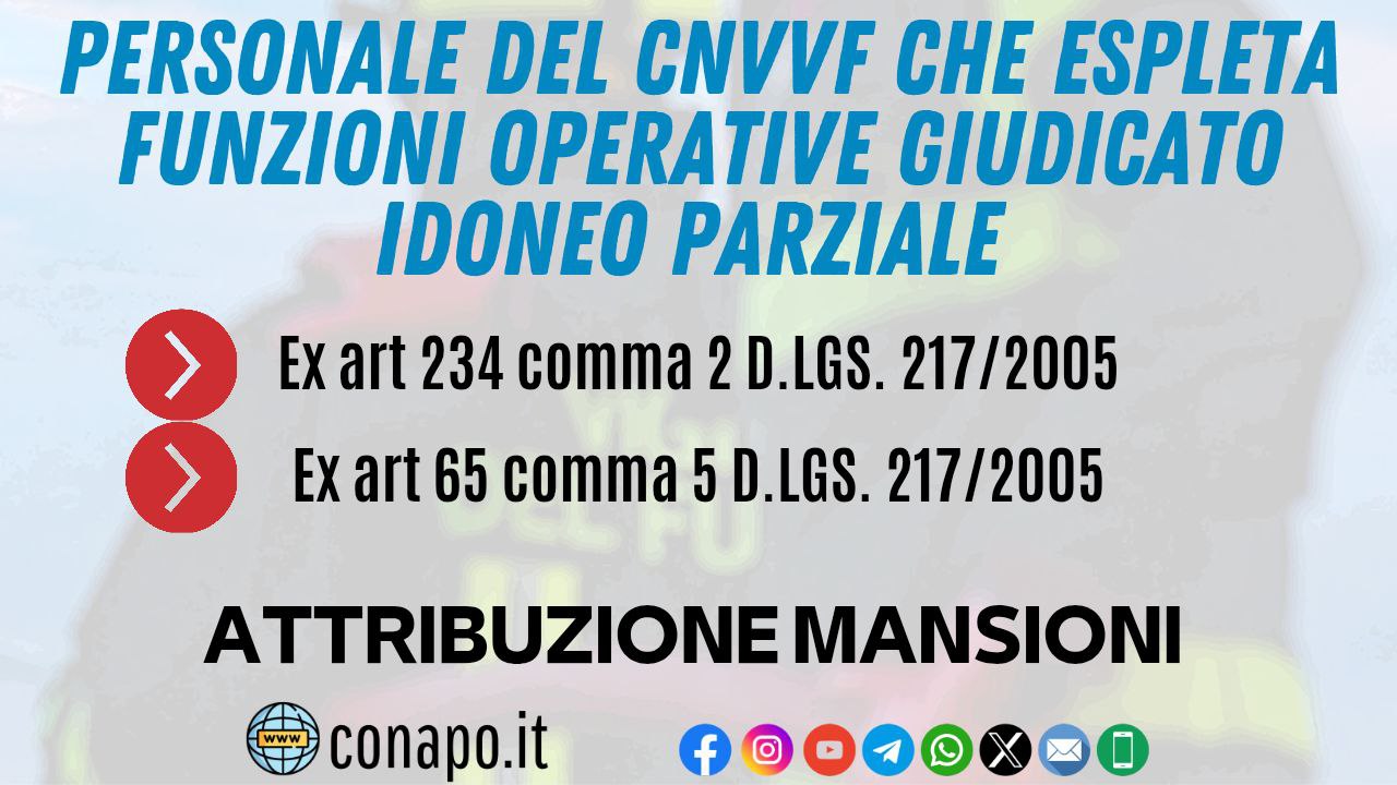 Personale del Corpo nazionale dei vigili del fuoco dichiarato idoneo nella forma parziale al servizio appartenente al ruolo che espleta funzioni operative (ex art. 234, comma 2 del D.Lgs. n. 217/2005) ed al ruolo delle specialità (ex art. 65, comma 5 del D.Lgs. n. 217/2005) – Attribuzione della mansione