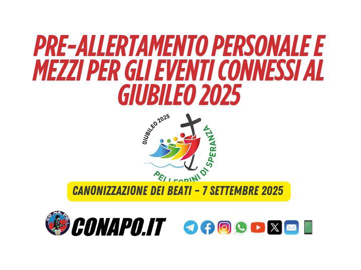 Pre-allertamento personale e mezzi per gli eventi connessi al Giubileo 2025. Canonizzazione dei Beati – 7 settembre 2025. da Redazione_Conapo 4 Settembre 2025 4 Settembre 2025 741 Leggi la nota Scarica il PDF Stampa Condividi 1 FacebookTwitterPinterestWhatsappTelegramEmail Potrebbe piacerti anche Screening oncologico e cardiovascolare per il personale in servizio e in quiescenza. 4 Dicembre 2025 Il Governo incontra Forze Armate, Comparto Sicurezza e Soccorso Pubblico. 4 Dicembre 2025 Buona Santa Barbara. 4 Dicembre 2025 Avvio 103° corso Allievi Vigili del Fuoco 3 Dicembre 2025 Procedura di selezione per 18 posti di specialista di aeromobile vigile del fuoco per... 3 Dicembre 2025 Avviso relativo alla “prova pratica tecnica” per l’accertamento dei requisiti attitudinali della selezione interna... 2 Dicembre 2025 post precedente Concorso pubblico a 7 posti per l’accesso al ruolo degli atleti del Gruppo sportivo Vigili del Fuoco Fiamme Rosse del CNVVF prossimo post Risposta a nota Conapo di richiesta scorrimento graduatoria concorso 69 posti Vice Direttore Logistico Gestionale.