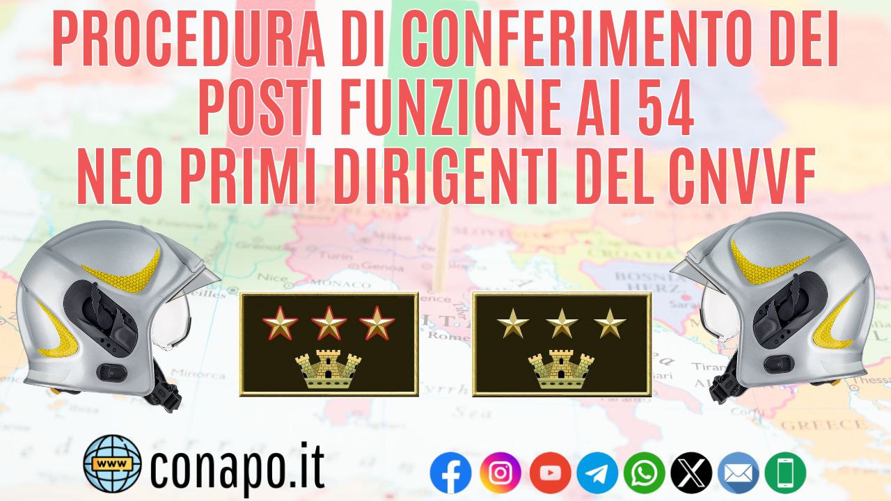 Procedura di conferimento dei posti funzione ai 54 neo primi dirigenti del CNVVF da Redazione_Conapo 19 Agosto 2024 19 Agosto 2024 3,7K Leggi la nota Scarica il PDF Stampa Condividi 0 FacebookTwitterPinterestWhatsappTelegramEmail Potrebbe piacerti anche Consiglio dei Ministri n. 151 – 11 Dicembre 2025 – Proroga termini – Disposizioni... 12 Dicembre 2025 Specialisti di aeromobile – Decreto di inquadramento ed assegnazione sede. 10 Dicembre 2025 Incontro governo-sindacati sulla legge di Bilancio, l’intervento del Segretario Generale Marco Piergallini. 9 Dicembre 2025 Procedura di assunzione di n. 97 unità nella qualifica di operatore nel ruolo degli... 9 Dicembre 2025 Nomina in ruolo dei Vigili del Fuoco appartenenti al 100° corso di formazione teorico-pratico... 9 Dicembre 2025 Concorso pubblico a 52 posti per l’accesso alla qualifica di Ispettore logistico gestionale del... 9 Dicembre 2025 post precedente Conferimenti e conferme incarichi dirigenziali del CNVVF decorrenza 30/09/2024 prossimo post Informativa relativa all’attribuzione di incarichi dirigenziali in temporanea reggenza.