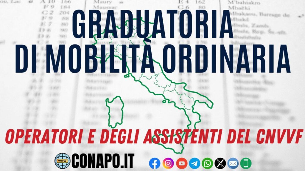 Procedura di mobilità ordinaria del personale appartenente al ruolo degli Operatori e degli Assistenti – Pubblicazione graduatoria. da Redazione_Conapo 17 Luglio 2024 17 Luglio 2024 1,4K Leggi la nota Scarica il PDF Stampa Condividi 0 FacebookTwitterPinterestWhatsappTelegramEmail Potrebbe piacerti anche Concorso pubblico a 52 posti di Ispettore logistico gestionale del Corpo nazionale dei vigili... 18 Dicembre 2025 Avviso pubblicazione graduatoria concorso pubblico, per esami, a 38 posti per l’accesso alla qualifica... 18 Dicembre 2025 Attribuzione degli scatti convenzionali al 31 dicembre 2024 a favore del personale del Corpo... 17 Dicembre 2025 Elezione dei rappresentanti dei lavoratori per la sicurezza. 16 Dicembre 2025 Consiglio dei Ministri n. 151 – 11 Dicembre 2025 – Proroga termini – Disposizioni... 12 Dicembre 2025 Specialisti di aeromobile – Decreto di inquadramento ed assegnazione sede. 10 Dicembre 2025 post precedente Concorso CS decorrenza 01.01.2023. Richiesta pubblicazione elenco, in ordine di graduatoria e con l’indicazione della sede di provenienza, del personale ammesso a frequentare il corso di formazione. prossimo post LIGURIA – Preoccupante carenza operatori SAF 2A nei Comandi della Liguria. Richiesta svolgimento tempestivo corso regionale per Operatori SAF 2A.