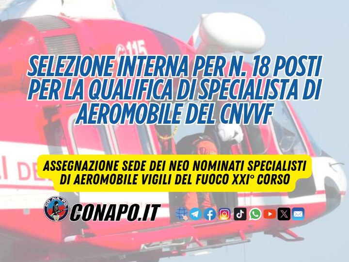 Procedura di selezione per 18 posti di specialista di aeromobile vigile del fuoco per le esigenze dei reparti volo del Corpo Nazionale dei Vigili del Fuoco. Assegnazione sede dei neo nominati specialisti di aeromobile vigili del fuoco.