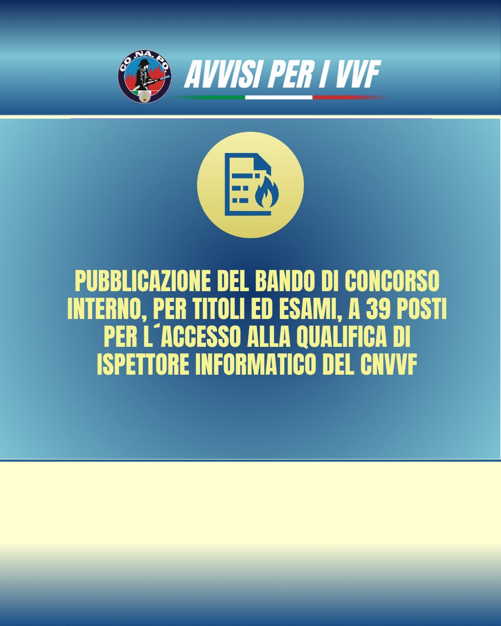 HomeNewsPubblicazione del bando di concorso interno, per titoli ed esami, a 39 posti per l’accesso alla qualifica di ispettore informatico del Corpo Nazionale dei vigili del fuoco.