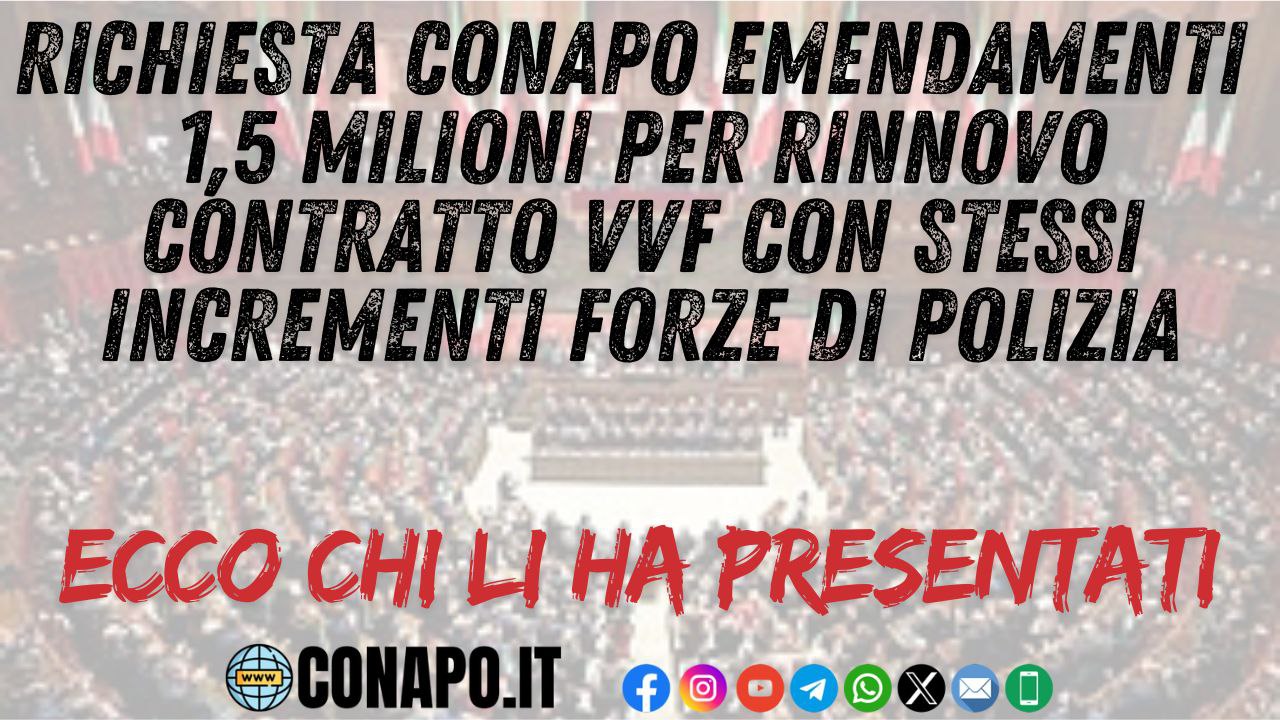 HomeBacheca SindacaleRichiesta Conapo emendamenti per + 1,5 milioni per rinnovo contratto VVF con stessi incrementi forze di polizia – Ecco chi li ha presentati