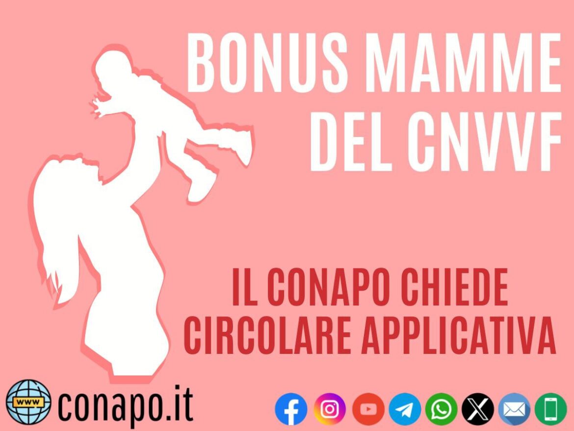 Tanto sopra premesso il CONAPO chiede che il Dipartimento dei Vigili del Fuoco renda note, con urgenza, le modalità di richiesta del beneficio retributivo in oggetto, per le mamme che ne hanno i requisiti.