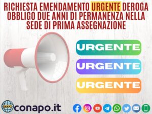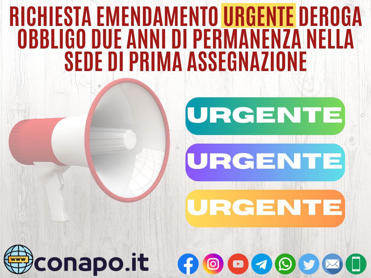 Oggetto: Richiesta emendamento URGENTE per deroga all’obbligo per i Vigili del Fuoco di due anni permanenza nella sede di prima assegnazione e nelle more richiesta di deroga temporanea da parte del Dipartimento dei Vigili del Fuoco.