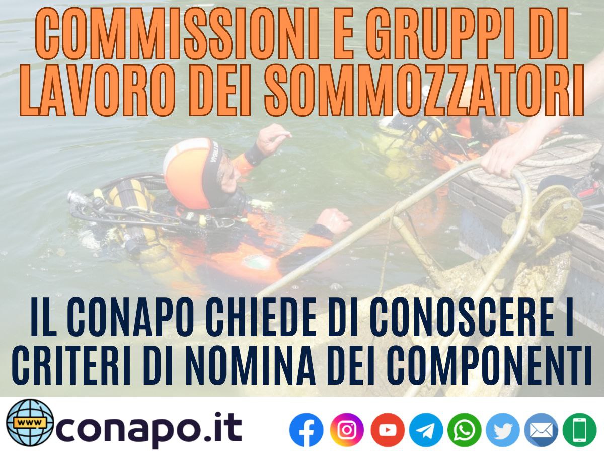 Tanto sopra premesso, il CONAPO chiede di ricevere tutte le informazioni del caso in merito alle commissioni e ai gruppi di lavoro attualmente istituiti per la specializzazione SOMMOZZATORI e di conoscere i criteri che sono stati utilizzati per la nomina dei rispettivi componenti, ivi compresi i criteri di nomina del personale operativo specialista SOMMOZZATORE.