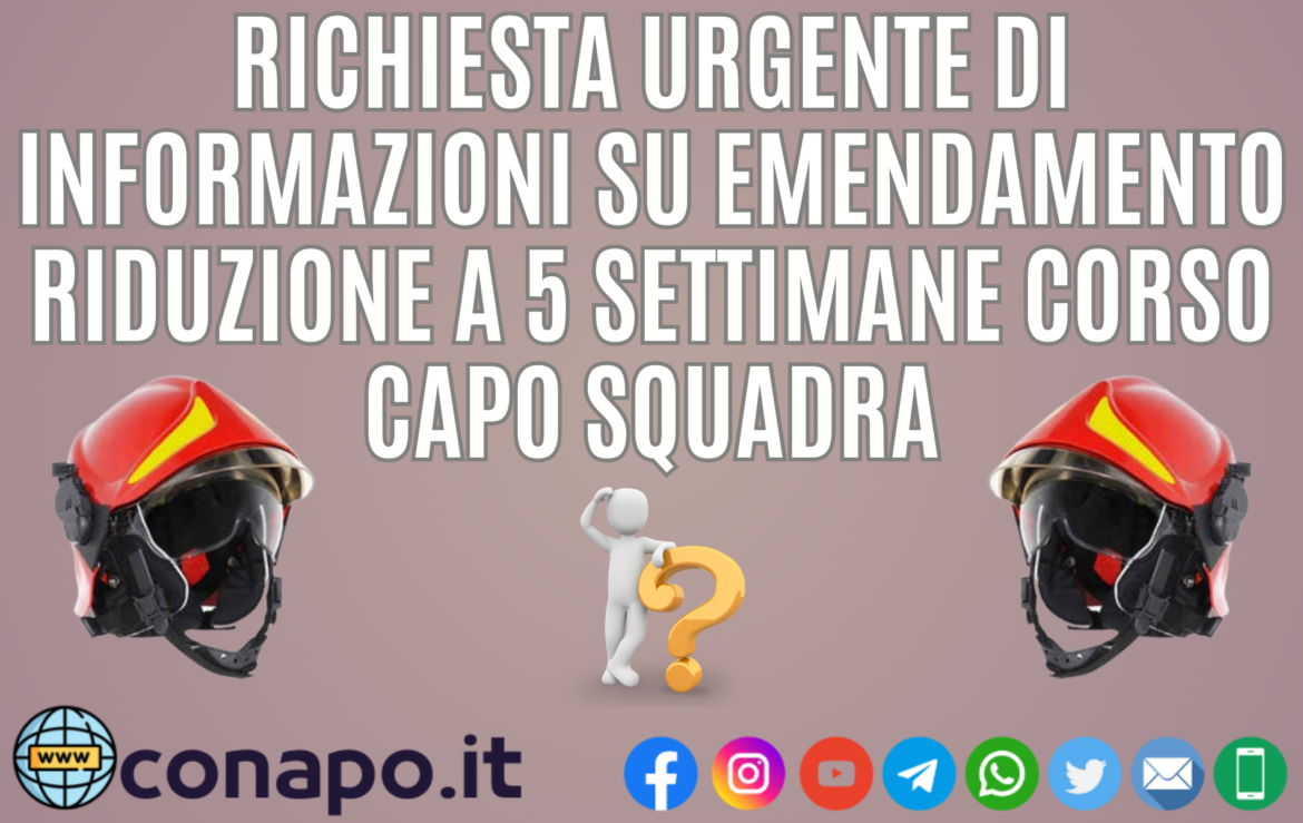 Per quanto sopra il CONAPO chiede urgenti notizie per il personale interessato in merito alla conferma o meno dell’inizio del corso di formazione a Capo Squadra per la data del 19 Giugno 2023 (tra dieci giorni), nonché di dare certa ed urgente informazione in merito all’iter dell’emendamento (fantasma) sulla riduzione a 5 settimane del corso di formazione.