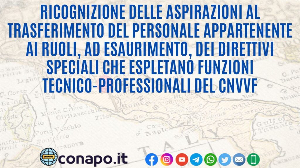 HomeNewsRicognizione delle aspirazioni al trasferimento del personale appartenente ai ruoli dei Direttivi Speciali che espletano funzioni tecnico-professionali del CNVVF.