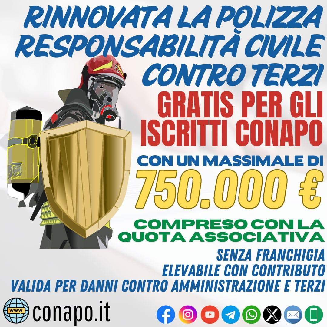 🔴 RINNOVATA LA POLIZZA RESPONSABILITA’ CIVILE CONTRO TERZI PER COLPA GRAVE CON MASSIMALE DI 750.000 € GRATIS PER CIASCUN VIGILE DEL FUOCO ISCRITTO AL CONAPO