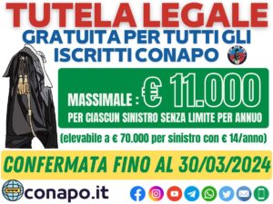 Rinnovo assicurazione per la tutela legale iscritti Conapo anno 2023/2024 – GRATIS per tutti gli iscritti. da Redazione_Conapo 31 Marzo 2023 31 Marzo 2023 1,9K Condividi 0 FacebookTwitterPinterestWhatsappTelegramEmail Potrebbe piacerti anche Attribuzione degli scatti convenzionali al 31 dicembre 2024 a favore del personale del Corpo... 17 Dicembre 2025 Elezione dei rappresentanti dei lavoratori per la sicurezza. 16 Dicembre 2025 Consiglio dei Ministri n. 151 – 11 Dicembre 2025 – Proroga termini – Disposizioni... 12 Dicembre 2025 Specialisti di aeromobile – Decreto di inquadramento ed assegnazione sede. 10 Dicembre 2025 Incontro governo-sindacati sulla legge di Bilancio, l’intervento del Segretario Generale Marco Piergallini. 9 Dicembre 2025 Procedura di assunzione di n. 97 unità nella qualifica di operatore nel ruolo degli... 9 Dicembre 2025 post precedente Concorso interno, per titoli ed esami, a n. 62 posti per l´accesso alla qualifica di ispettore antincendi del C.N.VV.F., di cui n. 52 da generico e n. 10 da radioriparatore prossimo post Evento “Roma 2023 – i Vigili del Fuoco Europei a Roma”.