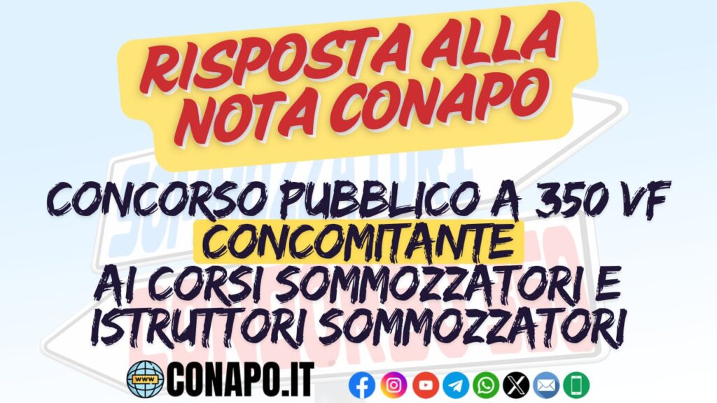 Risposta a nota CONAPO su concorso pubblico a 350 VF concomitante ai corsi Sommozzatori e Istruttori Sommozzatori. da Redazione_Conapo 8 Gennaio 2025 8 Gennaio 2025 975 Leggi la nota Scarica il PDF Stampa Condividi 0 FacebookTwitterPinterestWhatsappTelegramEmail Potrebbe piacerti anche Pubblicazione graduatorie finali – Concorsi pubblici a 7 posti per l’accesso alla qualifica di... 5 Dicembre 2025 Screening oncologico e cardiovascolare per il personale in servizio e in quiescenza. 4 Dicembre 2025 Il Governo incontra Forze Armate, Comparto Sicurezza e Soccorso Pubblico. 4 Dicembre 2025 Buona Santa Barbara. 4 Dicembre 2025 Avvio 103° corso Allievi Vigili del Fuoco 3 Dicembre 2025 Procedura di selezione per 18 posti di specialista di aeromobile vigile del fuoco per... 3 Dicembre 2025 post precedente Carenza di personale del ruolo dei capi squadra e dei capi reparto – Risorse straordinarie per il I trimestre 2025. prossimo post Conapo sollecita la Camera dei Deputati per approvare: legge delega riordino carriere, esaurimento graduatoria ispettori interni, deroga 2 anni prima sede per Giubileo.
