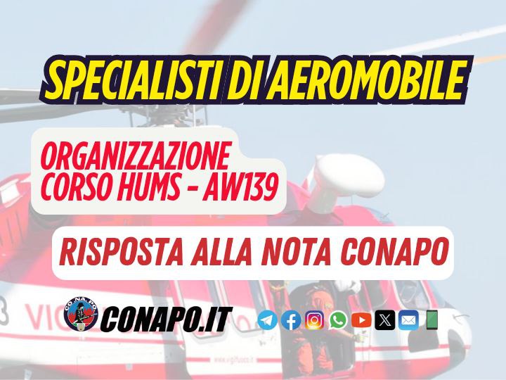 Risposta a nota CONAPO su specialisti di aeromobile organizzazione corso hums – AW139. da Redazione_Conapo 28 Maggio 2025 28 Maggio 2025 576 Leggi la nota Scarica il PDF Stampa Condividi 0 FacebookTwitterPinterestWhatsappTelegramEmail Potrebbe piacerti anche Attribuzione degli scatti convenzionali al 31 dicembre 2024 a favore del personale del Corpo... 17 Dicembre 2025 Elezione dei rappresentanti dei lavoratori per la sicurezza. 16 Dicembre 2025 Consiglio dei Ministri n. 151 – 11 Dicembre 2025 – Proroga termini – Disposizioni... 12 Dicembre 2025 Specialisti di aeromobile – Decreto di inquadramento ed assegnazione sede. 10 Dicembre 2025 Incontro governo-sindacati sulla legge di Bilancio, l’intervento del Segretario Generale Marco Piergallini. 9 Dicembre 2025 Procedura di assunzione di n. 97 unità nella qualifica di operatore nel ruolo degli... 9 Dicembre 2025 post precedente Mobilità del personale appartenente al ruolo dei vigili del fuoco. Incontro sindacale. prossimo post La risposta alla nota CONAPO su Concorso Vicedirettori Sanitari CNVVF.