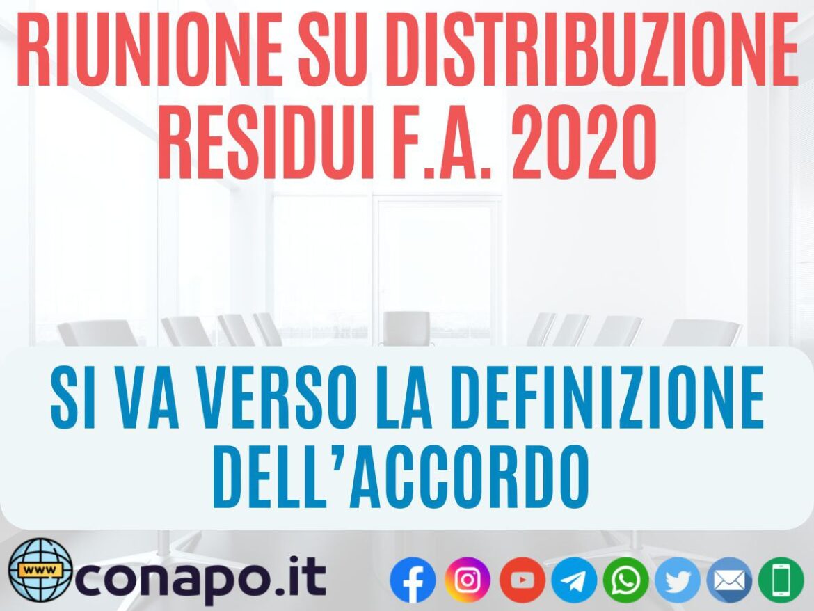Vista la parziale apertura dell’Amministrazione, che di fatto ha accolto gran parte delle richieste CONAPO, abbiamo espresso la disponibilità a firmare l’accordo FA 2020 se cosi rimodulato, al fine di fare arrivare nel più breve tempo possibile i fondi al personale.