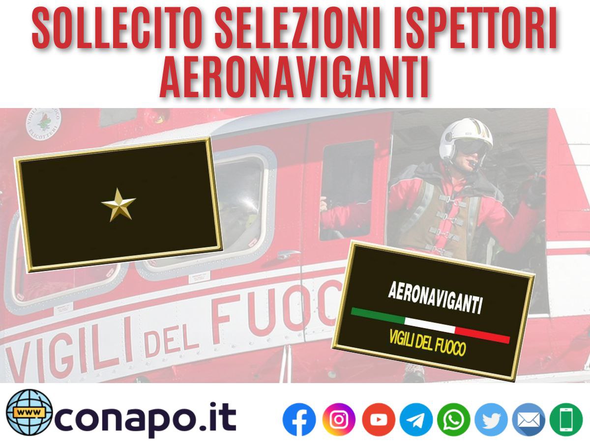 Per quanto sopra, questa O.S. CONAPO, al fine di ripianare al più presto gli organici previsti e permettere al personale interessato di avere la giusta progressione di carriera oltreché rendere disponibili ulteriori posti per le selezioni interne a Capi Squadra, chiede di emanare tempestivamente i bandi di selezioni interne per Ispettore Pilota di Aeromobile, Ispettore Specialista di Aeromobile ed Ispettore Elisoccorritore decorrenze 2019-2020-2021-2022.