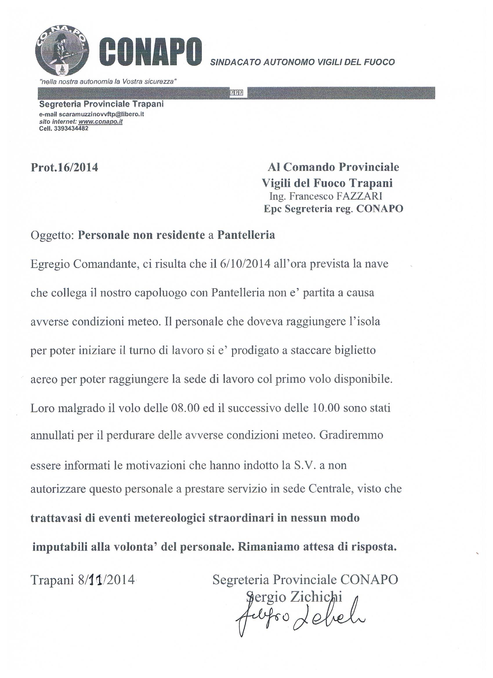 TRAPANI – Personale non residente e Pantelleria. da CONAPO 8 Novembre 2014 8 Novembre 2014 271 Condividi 0 FacebookTwitterPinterestWhatsappTelegramEmail Potrebbe piacerti anche PRATO – Escrementi di topi e uccelli nella mensa dei vigili del fuoco: proclamato... 2 Dicembre 2025 PERUGIA – Richiesta di intitolazione della sede VV.F. di Perugia alla memoria del Vigile... 28 Novembre 2025 BELLUNO – Il Prefetto accoglie la richiesta CONAPO dopo la segnalazione in merito alla... 24 Novembre 2025 RIMINI – Urgente ripristino impianto di climatizzazione presso distaccamento di Cattolica. 23 Novembre 2025 REGGIO EMILIA – Mozione ordinaria per il Consiglio comunale, carenza organico dei Vigili del... 21 Novembre 2025 REGGIO EMILIA – i motivi dello stato di agitazione CONAPO (video). 21 Novembre 2025 post precedente Personale promosso a Capo Squadra decorrenza 01.01.2010 – richiesta di adeguamento del trattamento retributivo. prossimo post Circolare corso di formazione Capo Squadra decorrenza 2011 – inizio corso previsto per il 17.11.2014.