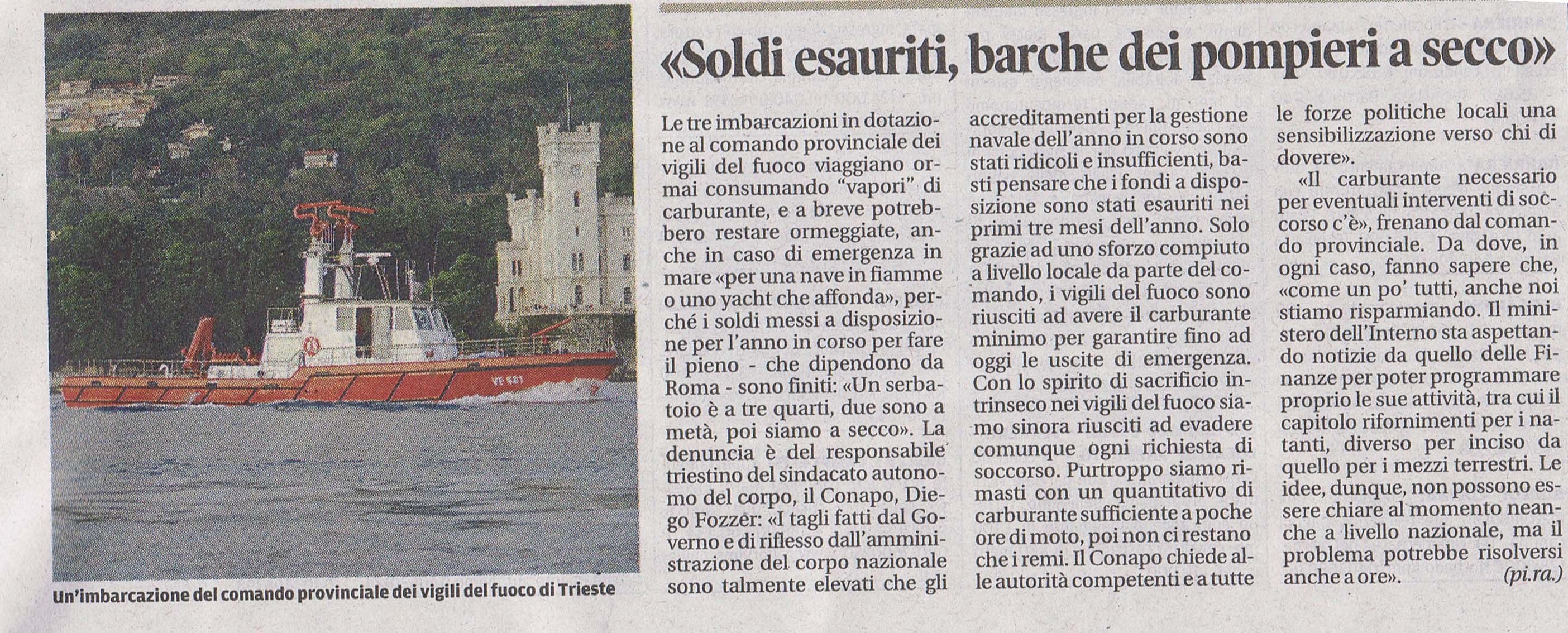 TRIESTE – Soldi esauriti, barche dei pompieri a secco. da CONAPO 5 Settembre 2011 5 Settembre 2011 326 Condividi 0 FacebookTwitterPinterestWhatsappTelegramEmail Potrebbe piacerti anche Convocazione incontro tecnico 2 febbraio 2022 per prosecuzione procedure negoziali relative al personale non... 28 Gennaio 2022 Convocazione incontro tecnico per prosecuzione procedure negoziali personale direttivo e dirigente comparto VV.F. e... 15 Settembre 2021 Missione DCF: Procedura di selezione per 56 posti di specialista sommozzatore per le esigenze... 7 Giugno 2021 SASSARI – Problematiche attività SAR per la ricerca delle persone disperse, mancata attivazione nel... 16 Febbraio 2021 Legge di bilancio 2021 – le richieste del CONAPO ai gruppi parlamentari. 27 Novembre 2020 Convenzioni Cralnetwork 6 Novembre 2020 post precedente Procedure richiesta elicottero. prossimo post Circolare 3^ corso nazionale istruttori di patenti di guida terrestri.