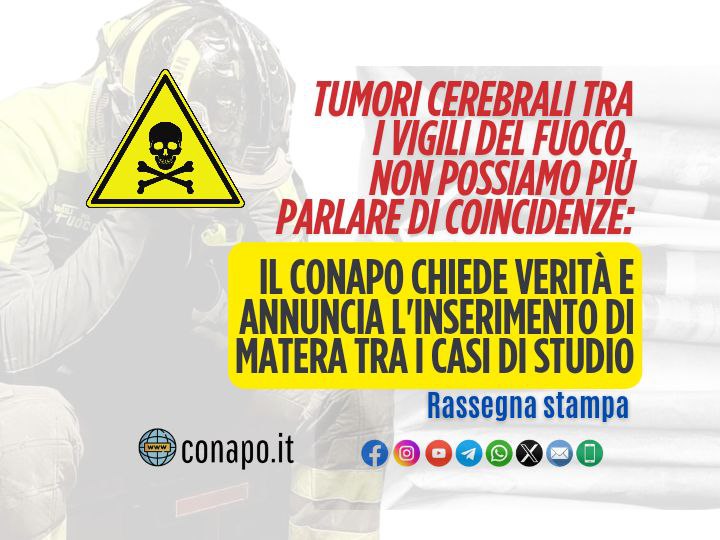 Tumori cerebrali tra i vigili del fuoco, non possiamo più parlare di coincidenze: il CONAPO chiede verità e annuncia l’inserimento di Matera tra i casi di studio (rassegna stampa).