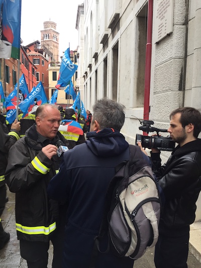 Diverse sono state le testate giornalistiche che ci hanno intervistato i cui servizi sono andati in onda su diverse reti. Il corteo si è mosso attraverso le calli e i canali della città fino a raggiungere il palazzo del prefetto. Durante il tragitto grande coinvolgimento dei cittadini che ci fermavano per chiedere informazioni e si affacciavano alle finestre per dimostrare la loro vicinanza a noi Vigili del Fuoco.