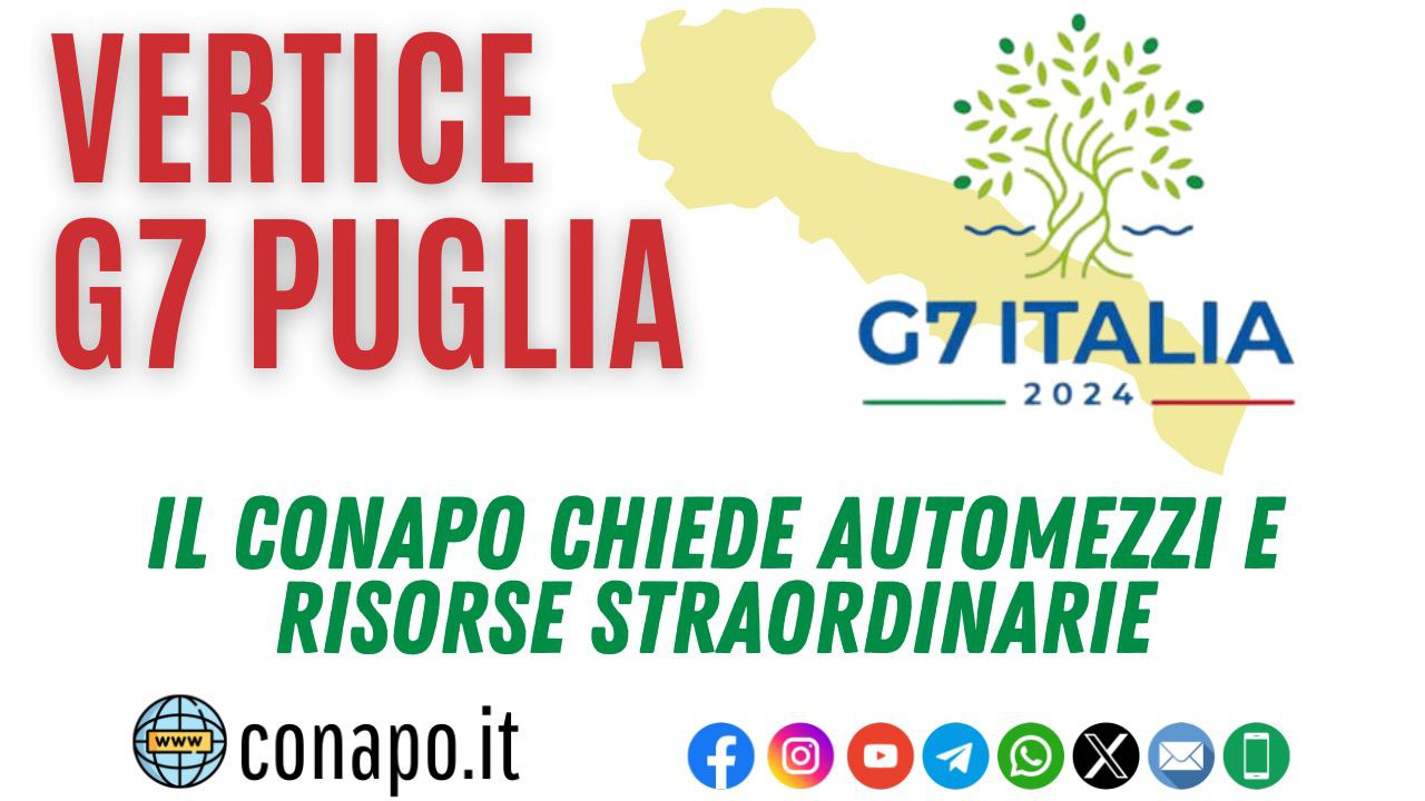 Oggetto: Vertice G7 – Borgo Egnazia 13 al 15 giugno 2024; Carenza di mezzi e richiesta di stanziamenti straordinari ed urgenti.