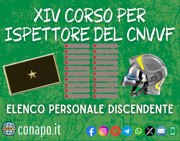 XIV corso per Ispettore Antincendi del CNVVF – Concorso interno per 62 posti – Elenco del personale discente. da Redazione_Conapo 15 Settembre 2023 15 Settembre 2023 1,8K Leggi la nota Scarica il PDF Stampa Condividi 0 FacebookTwitterPinterestWhatsappTelegramEmail Potrebbe piacerti anche Attribuzione degli scatti convenzionali al 31 dicembre 2024 a favore del personale del Corpo... 17 Dicembre 2025 Elezione dei rappresentanti dei lavoratori per la sicurezza. 16 Dicembre 2025 Consiglio dei Ministri n. 151 – 11 Dicembre 2025 – Proroga termini – Disposizioni... 12 Dicembre 2025 Specialisti di aeromobile – Decreto di inquadramento ed assegnazione sede. 10 Dicembre 2025 Incontro governo-sindacati sulla legge di Bilancio, l’intervento del Segretario Generale Marco Piergallini. 9 Dicembre 2025 Procedura di assunzione di n. 97 unità nella qualifica di operatore nel ruolo degli... 9 Dicembre 2025 post precedente Circolare assegnazione alla prima sede di servizio – 94° Corso di formazione. prossimo post Applicazione ed esonero dall’applicazione del massimale contributivo Inps per il personale del CNVVF.